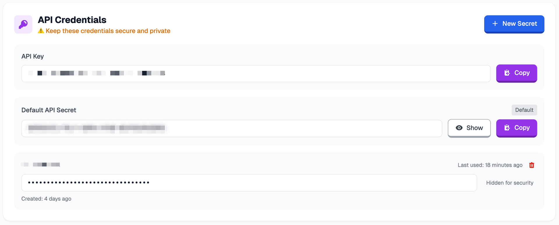 You can now create multiple API secrets for your account, giving you greater flexibility and security when managing access. This feature allows you to generate several secrets, which can be used for different applications or environments without needing separate API keys.