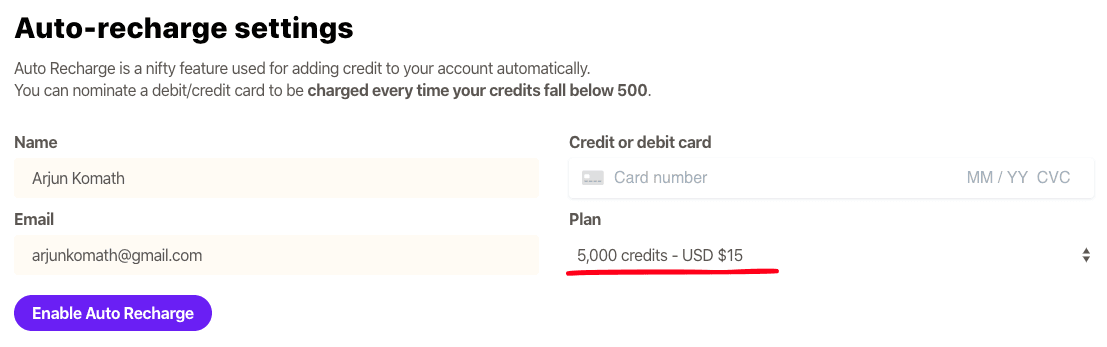 Auto-recharge will now let you select any plan of your choice. While enabling Auto-recharge from Capture console you can now see a dropdown to select the plan to recharge every time the credits fall below 500.
